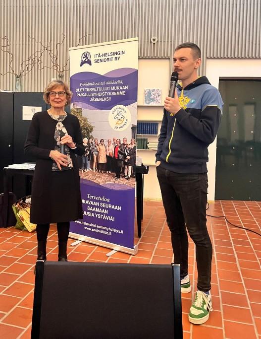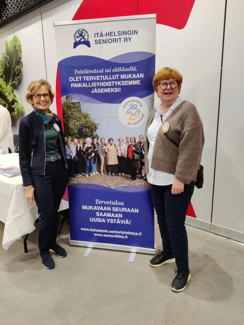 Eastonin 8 -vuotissynttäreillä 3.10.25 puheenjohtajistomme Tuula Karhumäki ja Ursula Viljakainen olivat markkinoimassa toimintaamme. Tuula suunnitteli ja hankki tapahtumaan yhdistyksellemme oman rullakko -ständin, johon kuva otettiin edellisellä viikolla Kotkan Maretariumin retkellämme. Oli ilo nähdä tuore Itä-Helsingin seniorien brändi-markkinointi. Tytti oli havainnut vilkasta jäseneksi liittymislomakkeiden kirjoittamista.